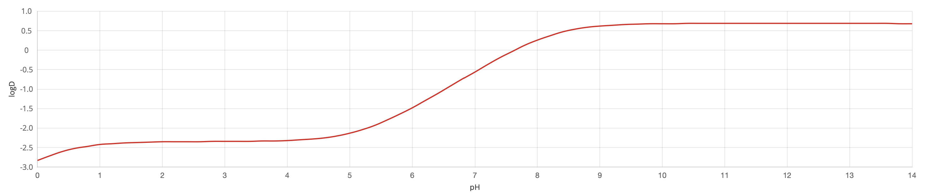 • logD (lipophilicity) vs. pH: increases from ~–2.5 at acidic pH to +0.5 at pH > 9.